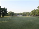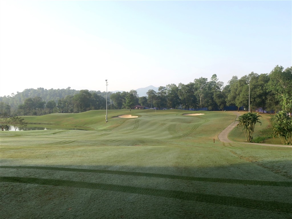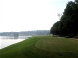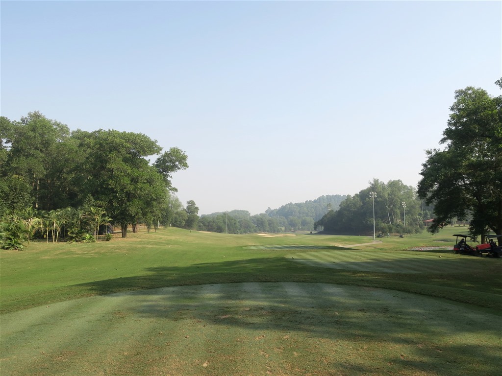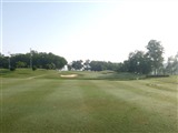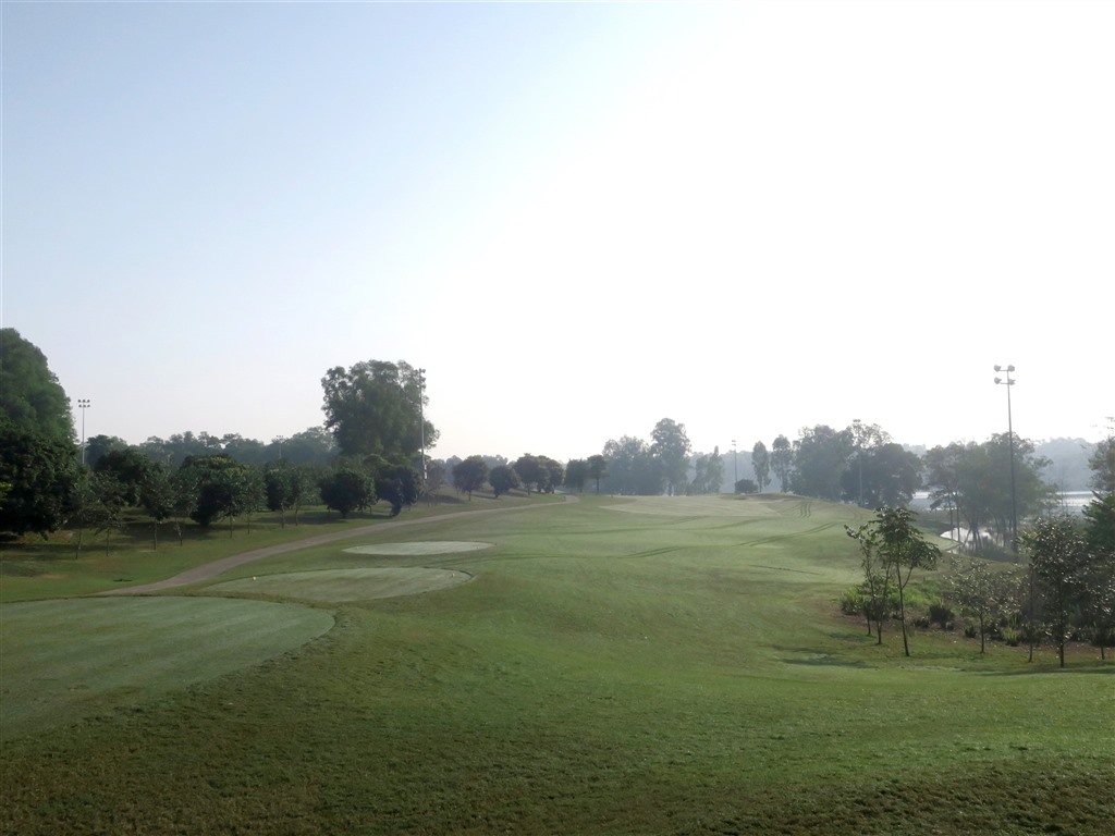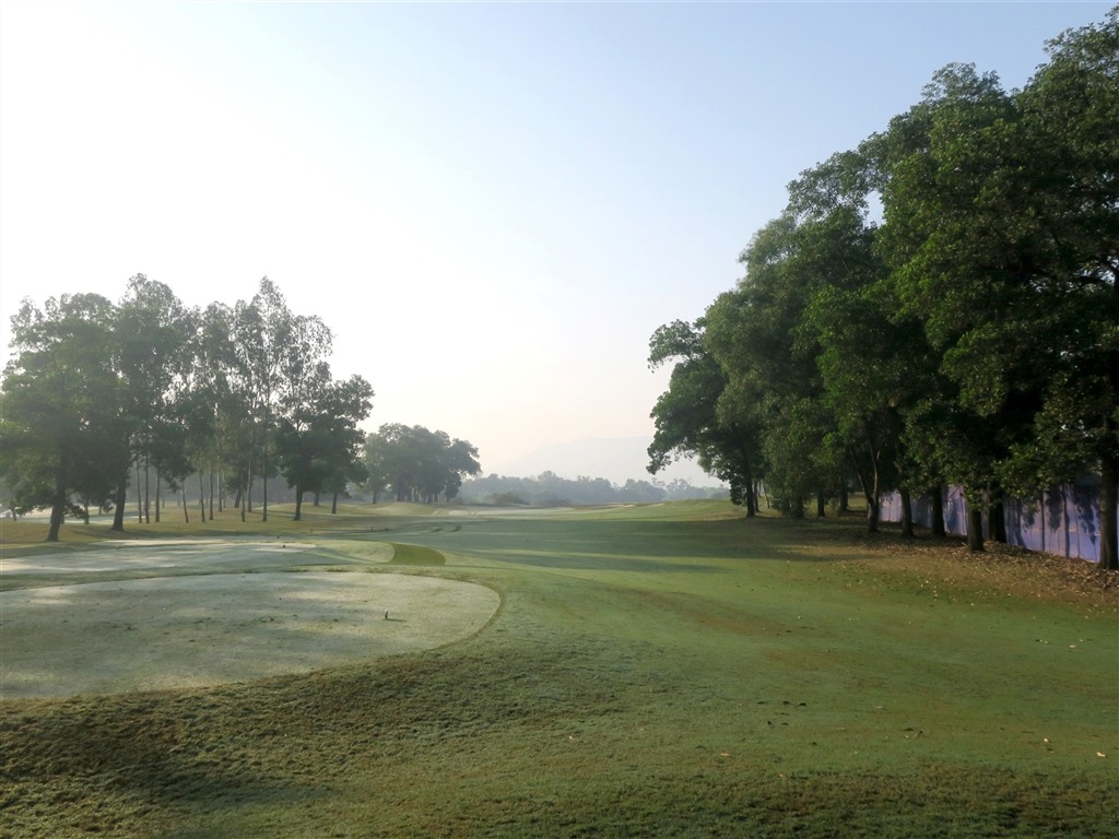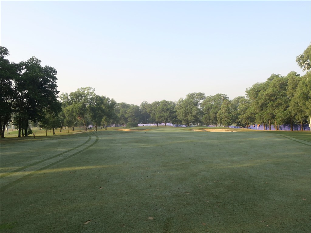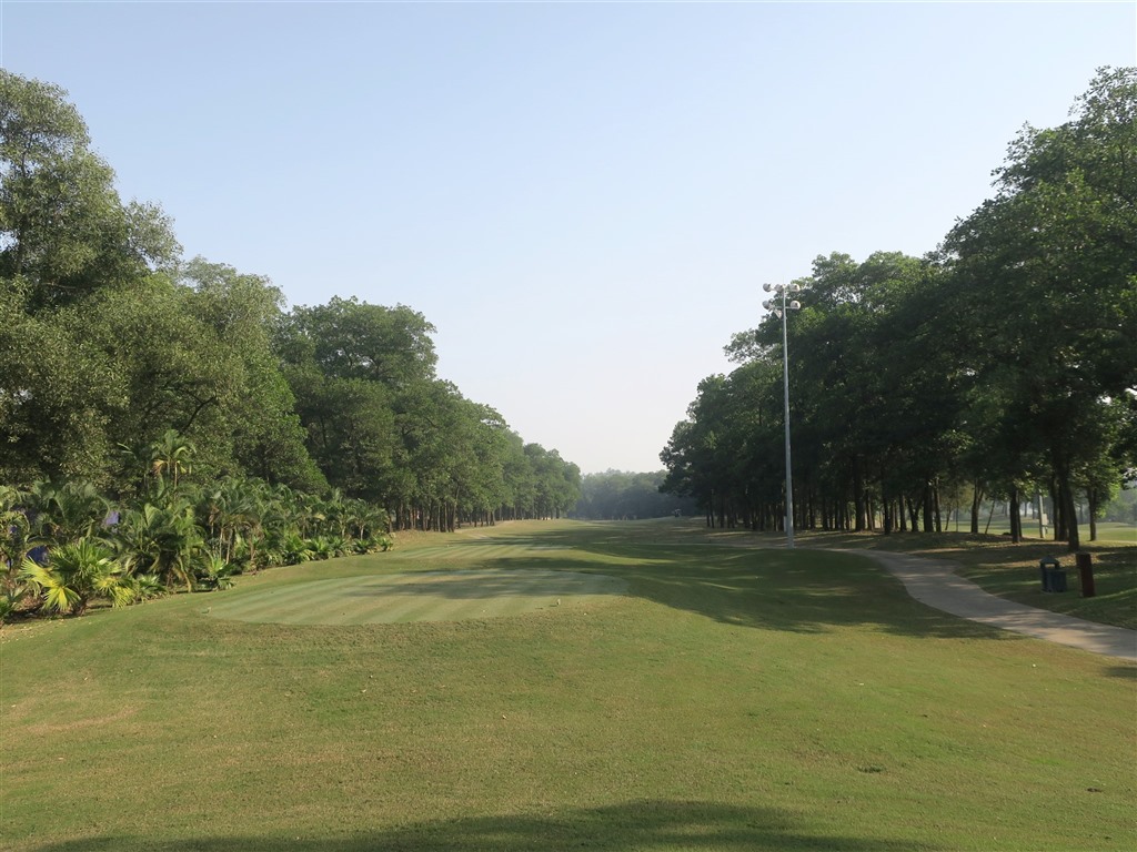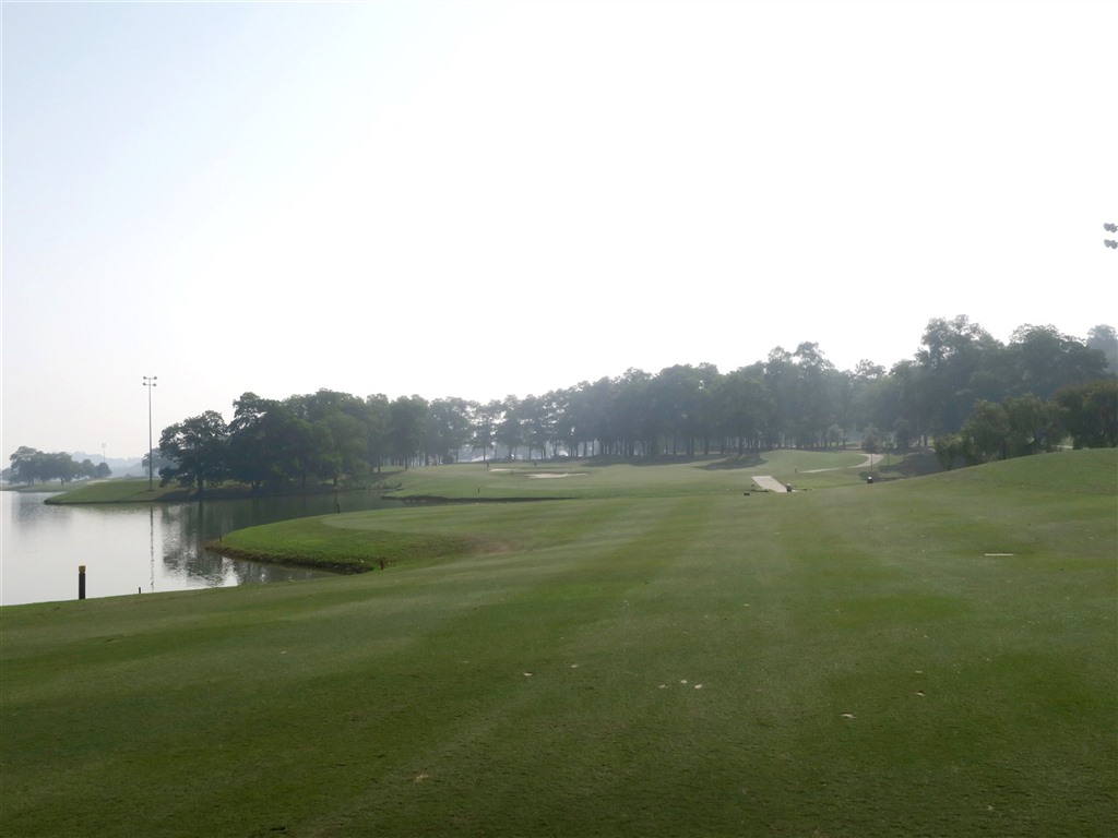 やや左ドッグレッグ。FWは真ん中のバンカーを挟んで左右に分かれている。セカンドは少し打ち下ろし。グリーンは縦に細長く、左サイドと奥は池に囲まれている。グリーンの奥半分は下り傾斜なので、ピン位置が奥の場合難度が増す。 |