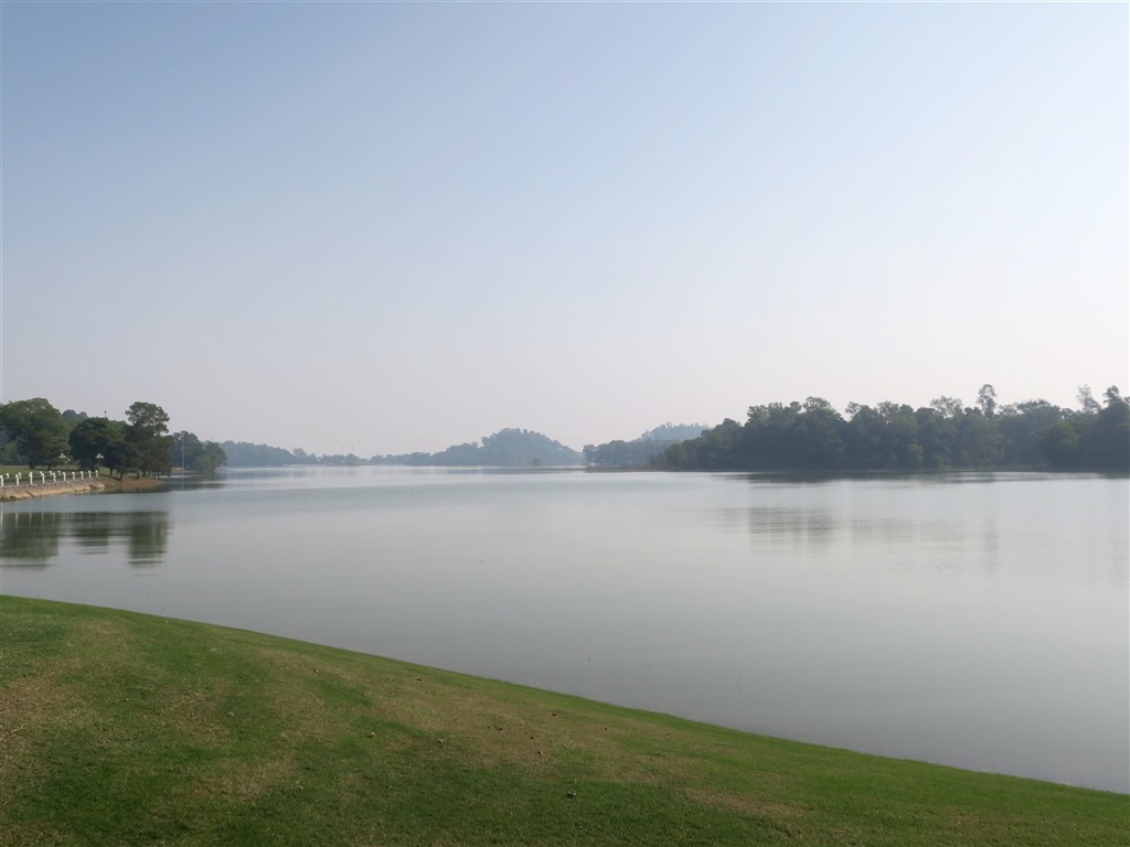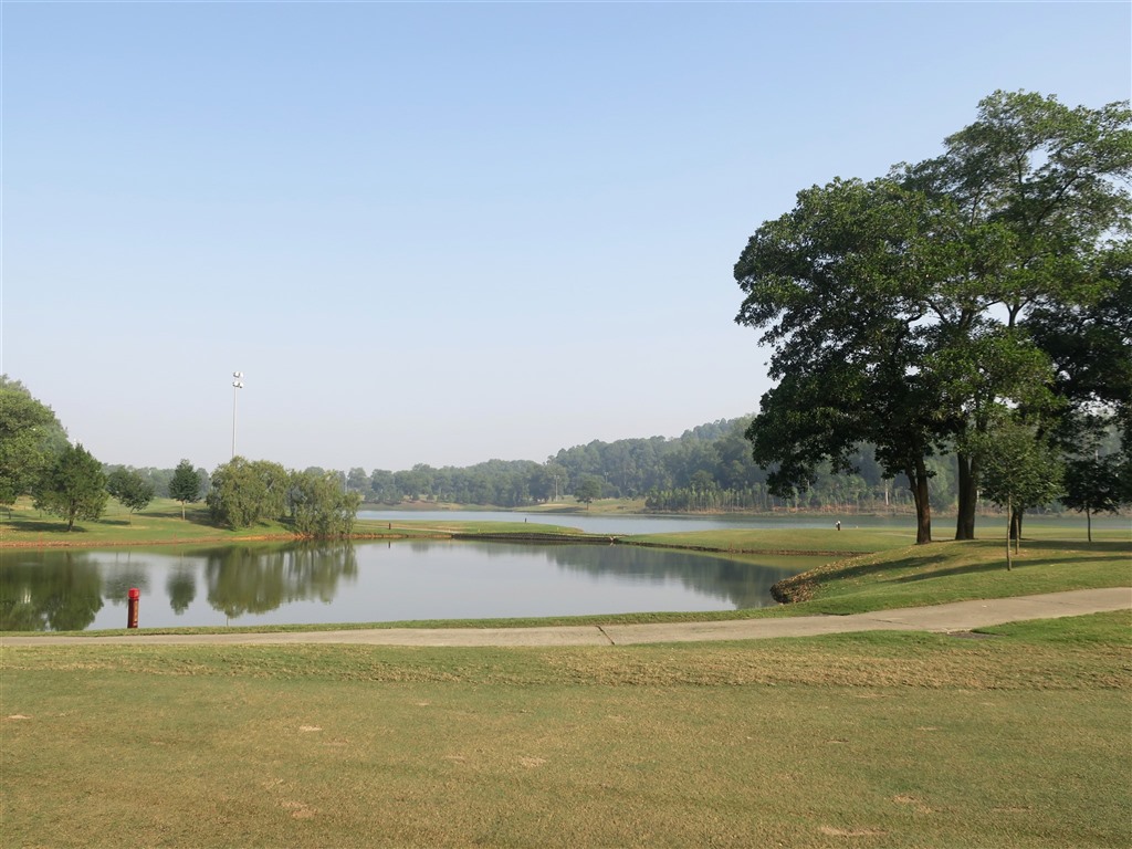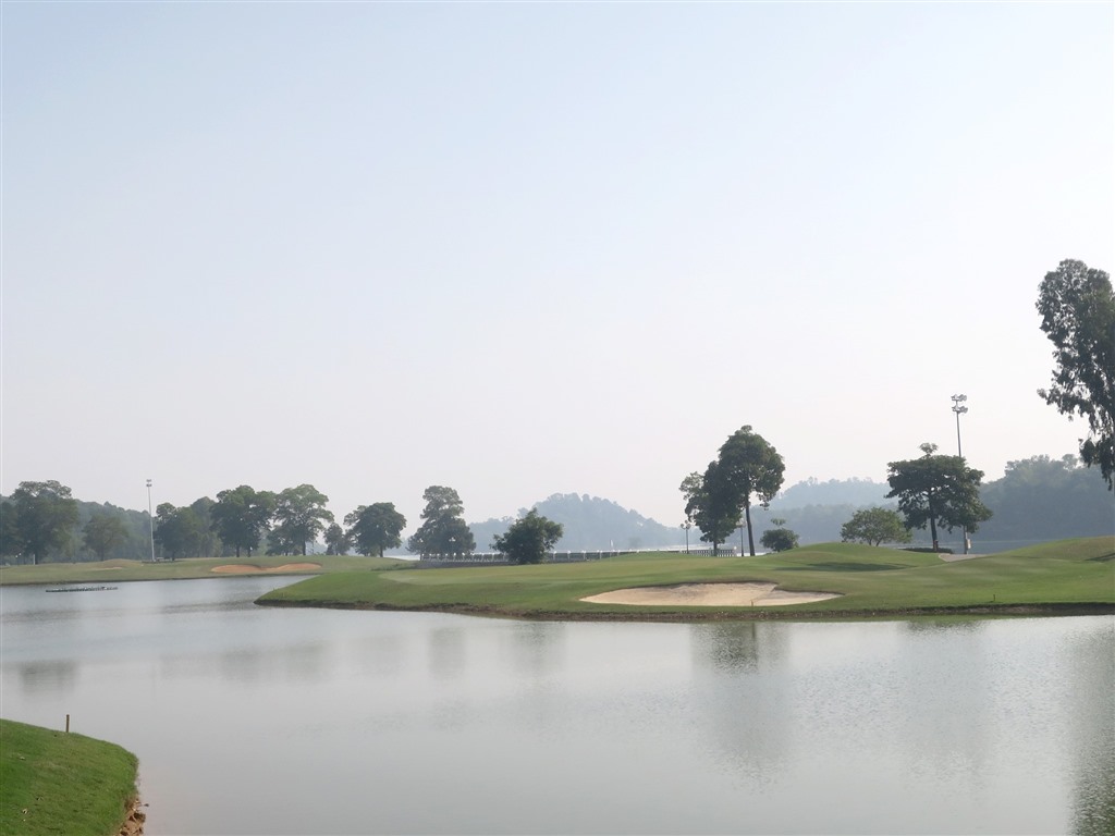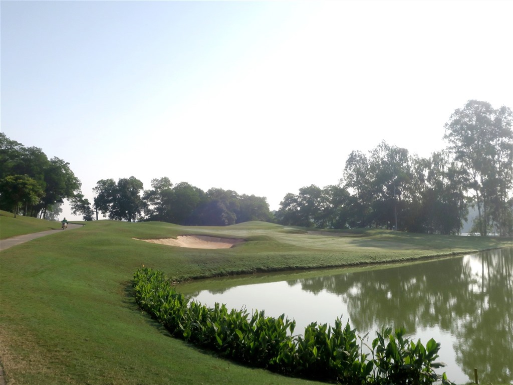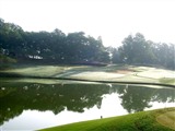 池越えの美しいショート。グリーンは左が池に接し、手前にはバンカーが配され、受けている。 |