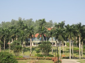 ハノイ中心地から車で50分、ノイバイ国際空港から車で1時間15分。さらに渡し船で5分乗船して対岸のクラブハウスに到着。船に乗らなくても同じ車で陸路でも行けるが余分に40分かかると聞く。メンバーシップコースだが、ビジターのプレーは可能。