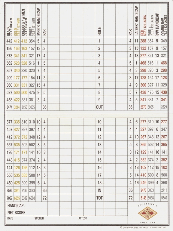 山岳コース。各ホールが山間にゆったり造られている。以前も牧場用地が、丘と谷のありの高低の激しい戦略コースに仕上がっている。後半の9ホールに印象的なホールが多い。グリーン上にはいくつかのアンジュレーションがあり、平らな場所がなく、パットも難しい。“プリザーブ”というコ-ス名は狩猟禁止地域の意味。