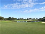 左ドッグレッグ。ティショットは池越えで、左サイドにパーム・ツリーの木立、右サイドに大きなバンカーがある。少し砲台のグリーンは縦に長く、右に傾斜していて、3個のバンカーでガードされている。 |
