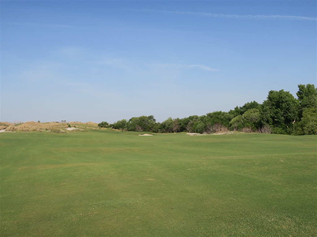 やや左ドッグレッグ。ティショットは打ち上げになり、FWを左から縦に90ヤード伸びる大きなバンカーにより、左右のスプリット(ダブル)FWを形成している。左のFWに打つとグリーンまで直線的ラインになるがFWは狭い、右のFWは広くて安全だが少し遠回りになる。セカンドはフラットになり、落し所の左に3個のFWバンカー右にデューンの丘がある。グリーンの左はデューンと1個のガードバンカーが配され、グリーンのグリーン前部の右半分の面は大きくえぐれている。