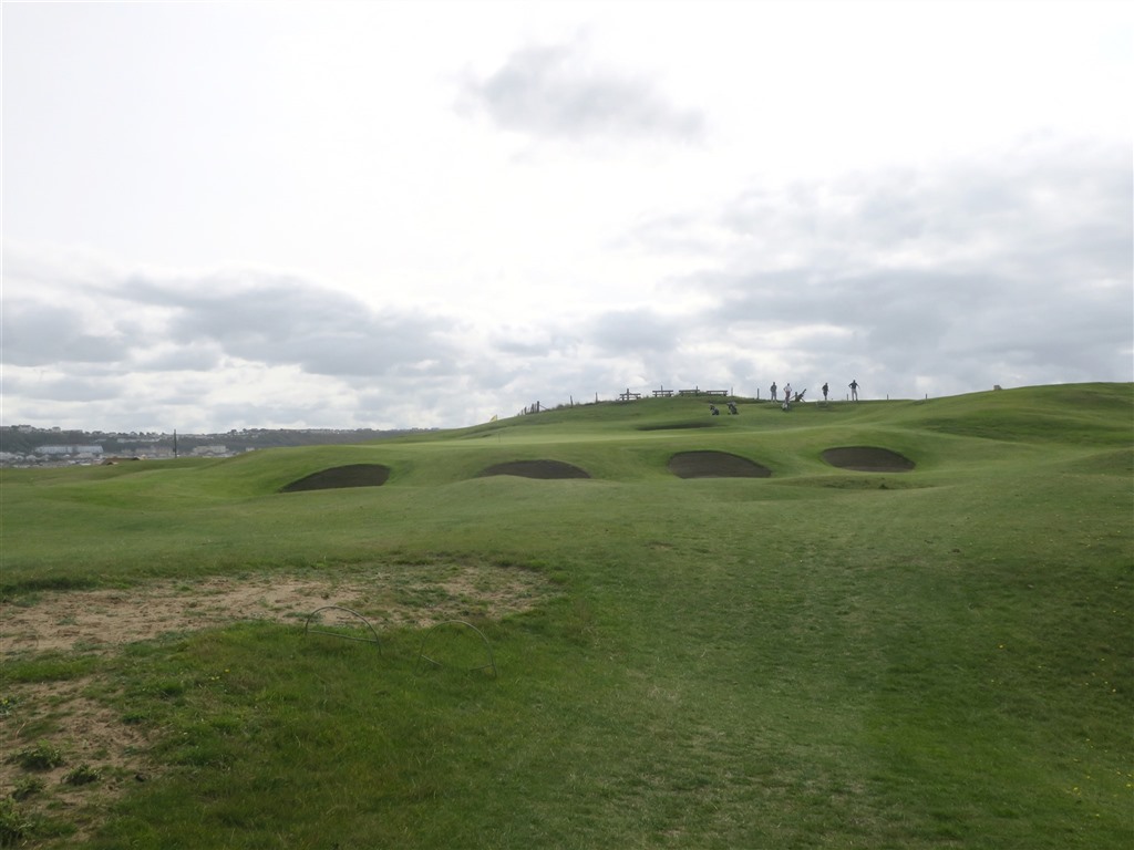 名物ホールでストレートの少し短いホール。ティショットでは2個横たわるとてつもなく大きいクロスバンカー越え。それらのバンカーの前方は高さ4,5メートルの枕木で補強されている。ティグランドからは一見ホールがとても狭く見えるが、実際落し所はそこまで狭くない。セカンドは緩やかな打ち下ろし。円形のグリーンの手前に4個のバンカーが配されている。 |