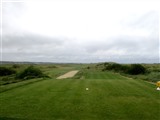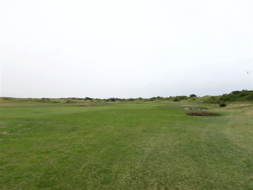 左ドッグレッグ。ティショットでは左サイドにOBになるデューンはあるが、FWは18番ホールと共有で広い。グリーンの右サイドに2個のポットバンカーがあり、グリーンは急な右傾斜。 |