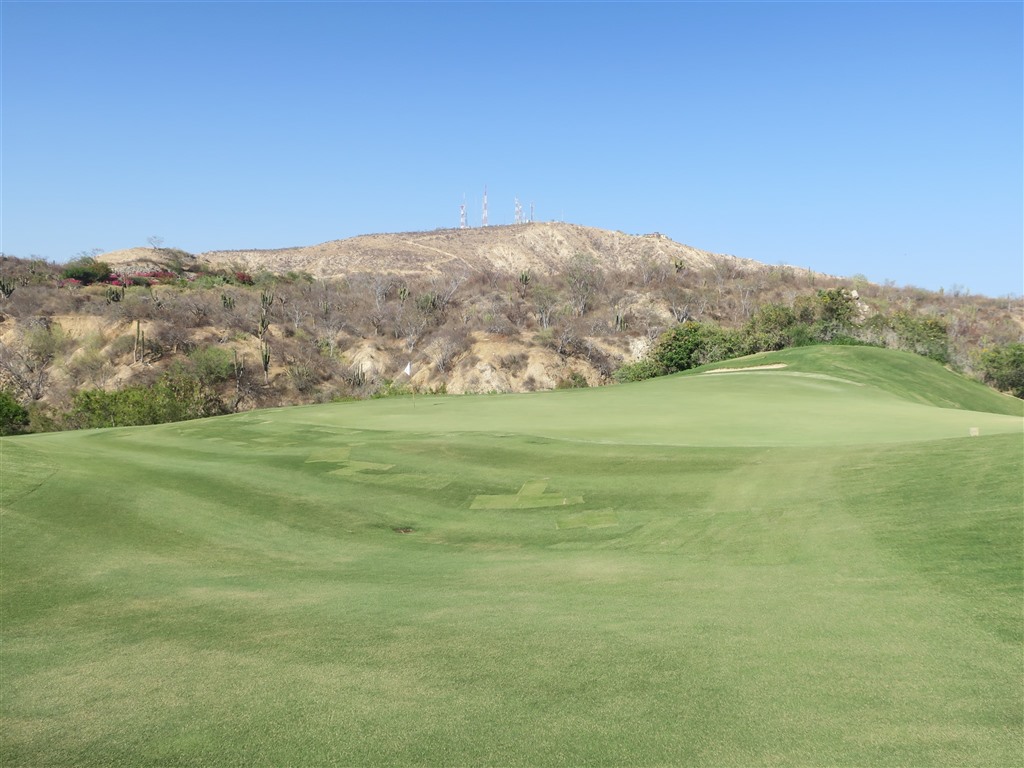 ほぼストレートの打ち上げ。ティショットはアロヨ越えで、FWは左傾斜しており左右にいくつかのバンカーがある。セカンドでのFWはタイト。グリーンは砲台で3個のバンカーでガードされている。 |