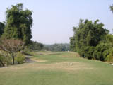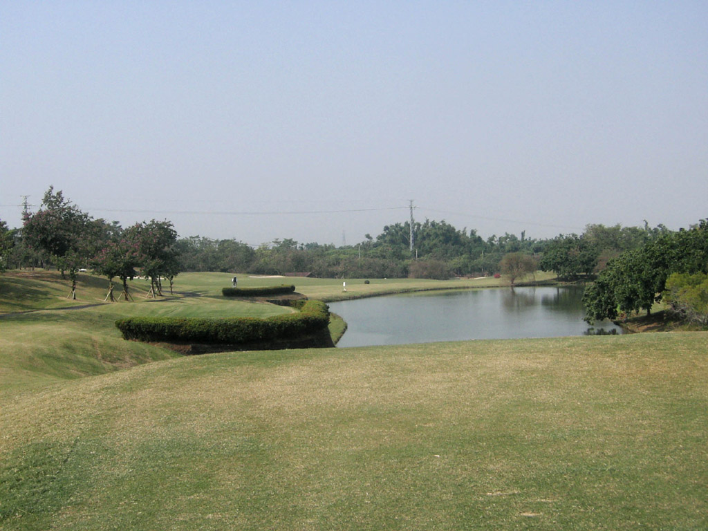 A difficult hole with slight dogleg to the right. There is a pond on the