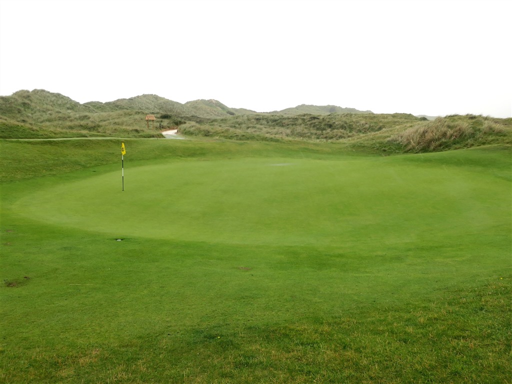 | 左手の線路沿いに少し左にドッレッグしている、とても短いミドル。ティショットでは左サイドは線路でOB、右サイドはデューンが迫っていて、FWは狭く左に傾斜している。この線路はよく効いているので、フックボールには要注意。グリーンは砲台で右サイドは上り傾斜になり、グリーンのアンジュレーションが強い。グリーン前部はフォールス・フロントになる。 |