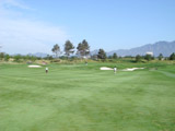 | ほぼストレートのロング。ティーからはフェアウェイ中央に配されたバンカーによりフェアウェイが左右に分かれていて、230ヤードのキャリーでそのバンカーは越えるので、ロングヒッターが有利な設計である。グリーンまで残り180ヤード地点から軽く右ドッグレッグしている。グリーンは少し砲台になり、手前のガードバンカーは深い。