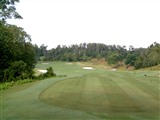 ティショットはブラインドになるが、美しいパー4。セカンドはやや打ち下ろしになり、グリーンすぐ左横の池が効いている。ホール左側からグリーン奥まで伸びる見事な原生林が目に焼きつく。 |