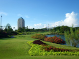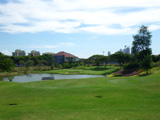 | 左ドッグレッグのミドルホール。ティーショットでは左から池がフェアウェイに食い込んでおり、落とし所が狭い。池を越えるには250ヤードのキャリーが必要。セカンドショットはグリーン右サイドに面している池に注意。グリーンは縦に長く、受けている。 |