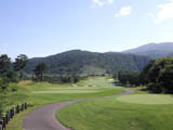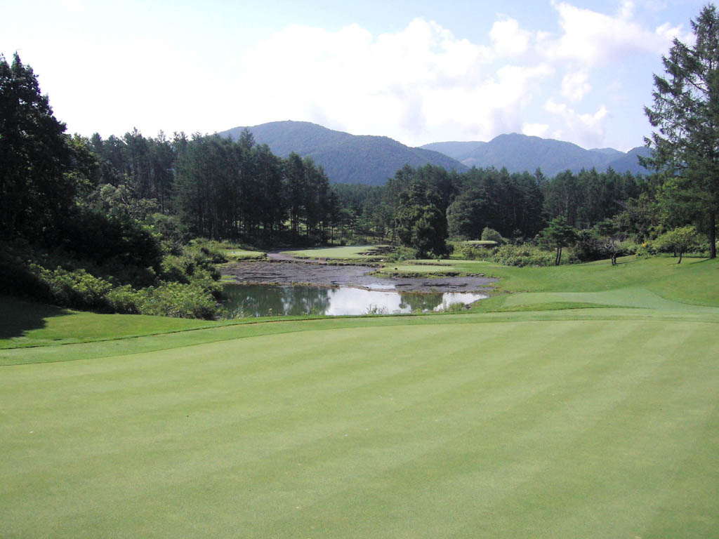 ストレートにグリーンを望めるパー5。左サイドが崖になっている。グリーンは砲台で、3番グリーンとの共有グリーンだが、2メートルくらいの落差があるので、3番グリーン面は見えない。グリーン背後に聳えたつ山が雄大。また、遥か後方には安達良山が見える。