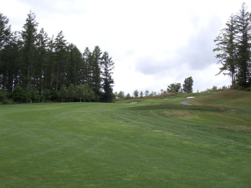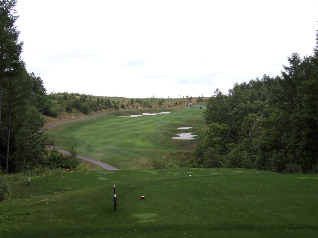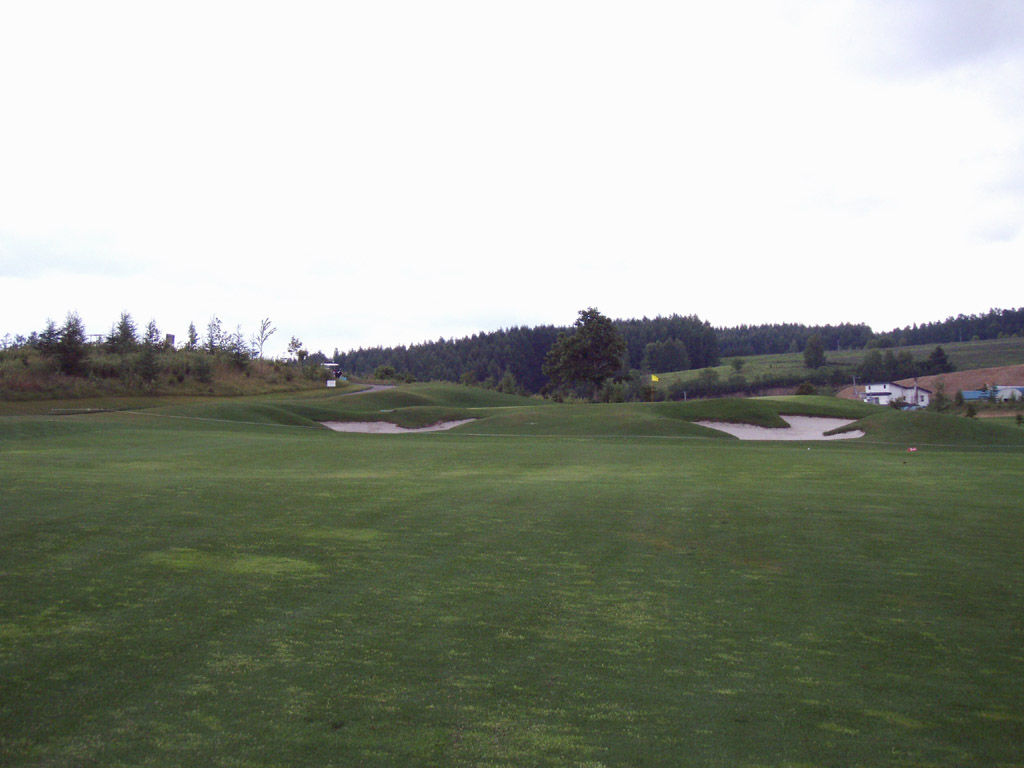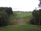 | なだらかな打ち下ろしの、やや左ドッグレッグのホール。セカンドショットは谷越えになり、グリーン手前をガードしている3つのバンカーが効いてくる。グリーンは左右の2段グリーン。 |