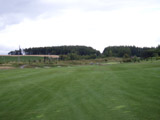 | 右ドッグレッグの緩やかな打ち上げのミドル。ティショットは池越え。グリーンは砲台で手前左右を2つのバンカーがガードしている。 |