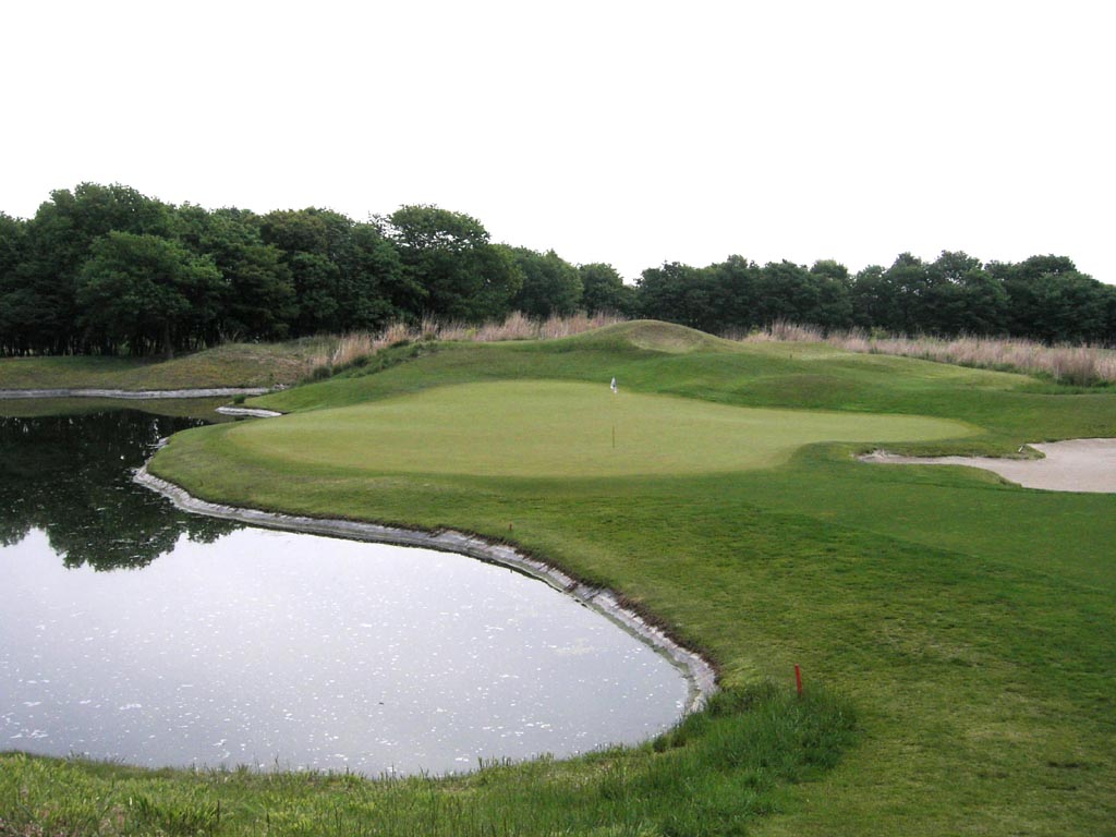 強い左ドッグレッグ。ティショットの安全ルートは左コーナーにあるバンカーの右のフェアウェイ。2オンを狙うロングヒッターは、そのバンカーの左に位置する出島のようなフェアウェイに打たなければならない。この場合は池越えのティショットになり、230から250ヤードの正確なキャリーボールが必要。セカンドショットは落し所が、右の池、左のマウンド群により狭くなっている。グリーンは右に振られていて、手前は池になる。このホールの後方から眺める景観は素晴らしい。 |