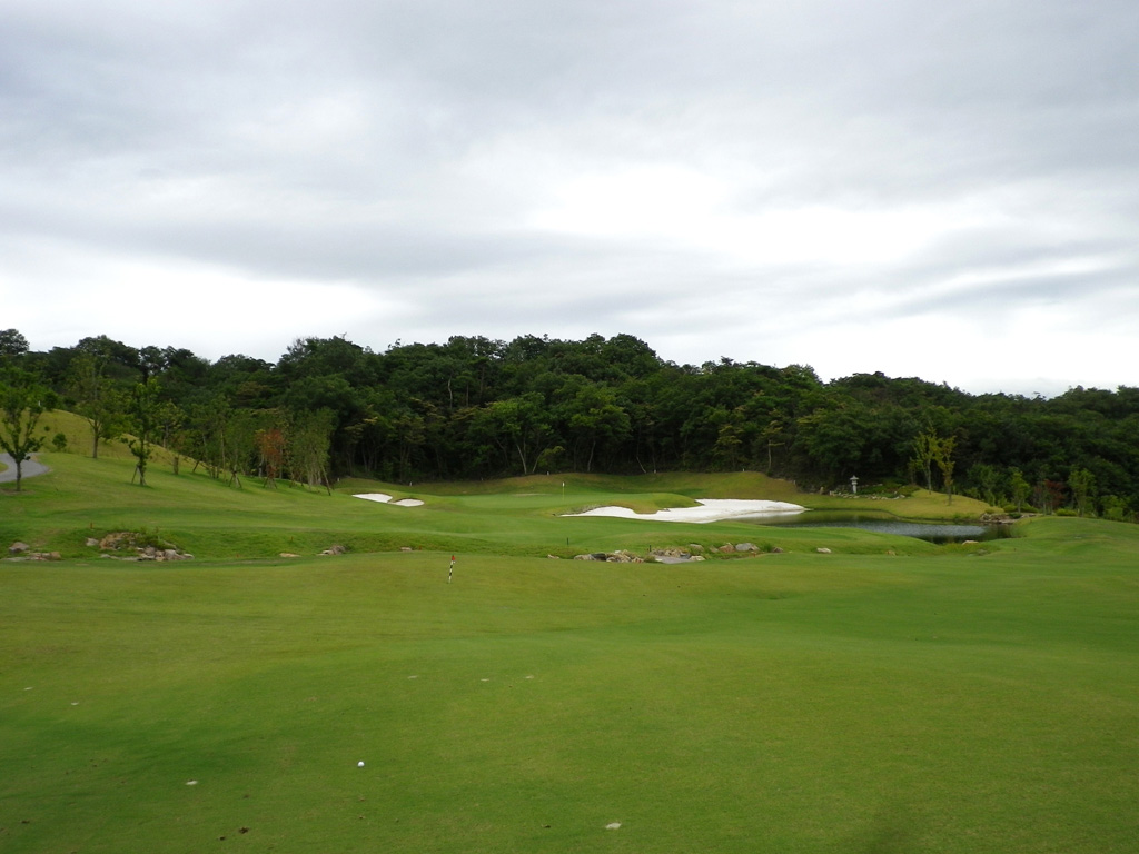 右ドッグレッグのミドル。グリーン右サイドは池に面して、縦長グリーンは左傾斜しているので、ピン位置が右の場合は難易度が増す。 |