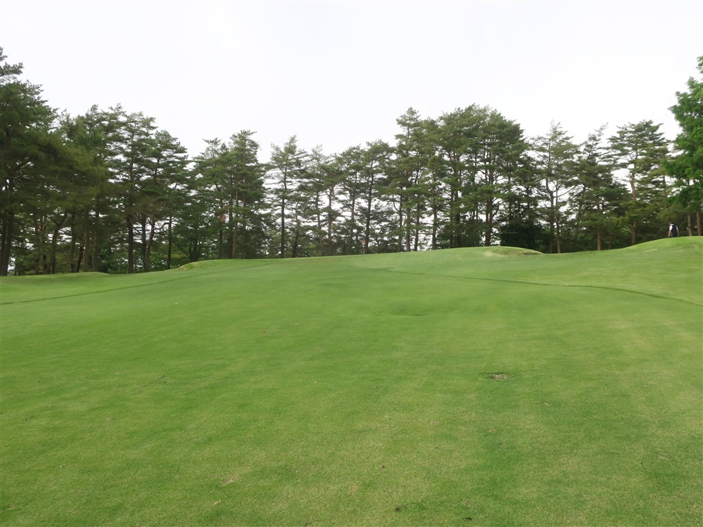 右ドッグレッグ。左サイドはグリーンまでOBが続き、右サイドは高い松林がスタイミーになる。ティショットは左右にバンカーもある。グリーンはほぼ円形で4個のバンカーに囲まれている。 |
