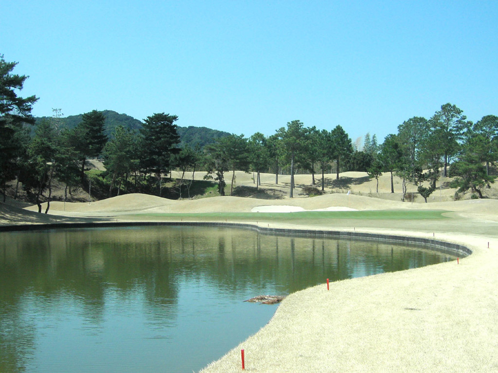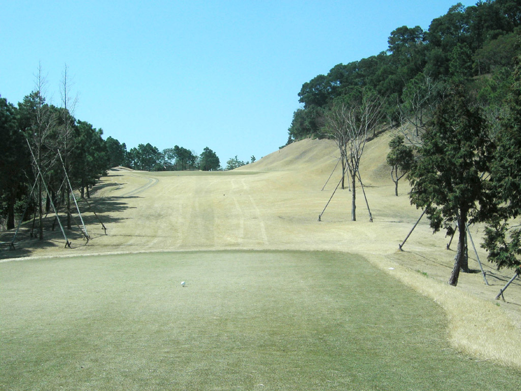 | 豪快な打ち下ろしホール。セカンドショットが難しく、左右のOBは浅いので正確なショットが要求される。天気良い日は、セカンド地点から遥か大阪湾を一望できる。 |