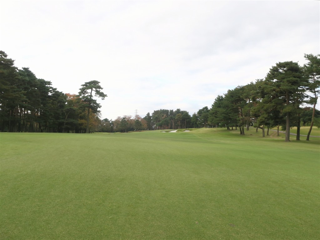 | 左ドッグレッグの難しいミドル。セカンドは緩やかな打ち上げ。グリーン(右側)は縦長の砲台で少し受けていて、左に2個、右に1個のバンカーでガードされている。 |