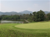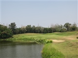 左に池が広がるやや左ドッグレッグ。ティショットは少し打ち下ろしになり、池越えの左フェアウェイには200ヤードキャリーで届く。グリーン手前から左は池。グリーンは右手前から左奥に斜めに伸びていて、奥からは急傾斜。