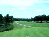 | 右に池が続く左ドッグレッグ。グリーン右手前にも池があるので、ロングヒッターのセカンドショットの落とし所を限定している。 |
