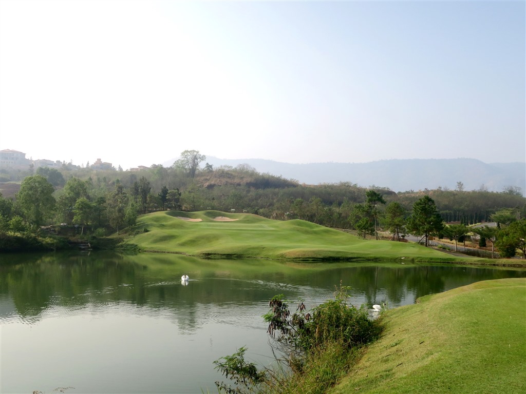 やや左ドッグレッグの短いミドルで、セカンドが池越えになる美しいホール。セカンドは緩やかな打ち下ろし。グリーンは受けていて、池と5個のバンカーで守られている。2番ホール同様、このホールも池に浮かぶ人工ティグランドから打っていく。